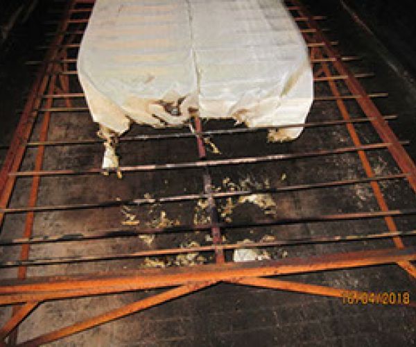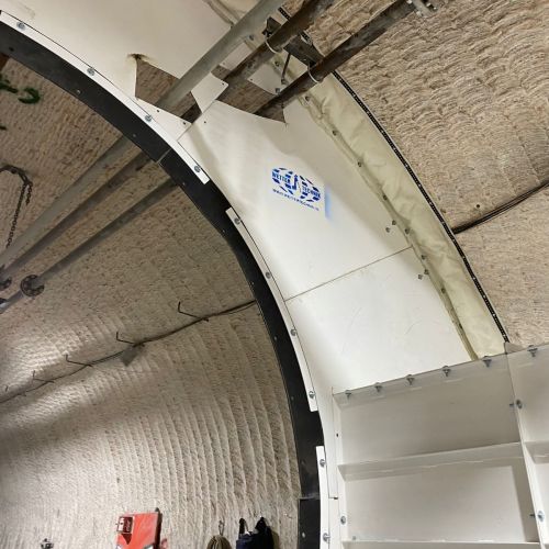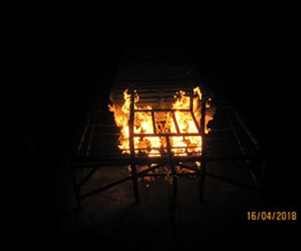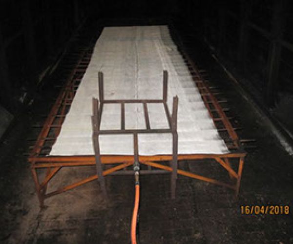 Die brandtechnische Prüfung nach DIN EN 12881-1, Verfahren B, mit Doppelbrenner wird an einem 4000mm langen Probekörper des DOKS®-Spezial VI Gewebe durchgeführt. Die Befeuerung erfolgt von beiden Seiten des Gewebes.
