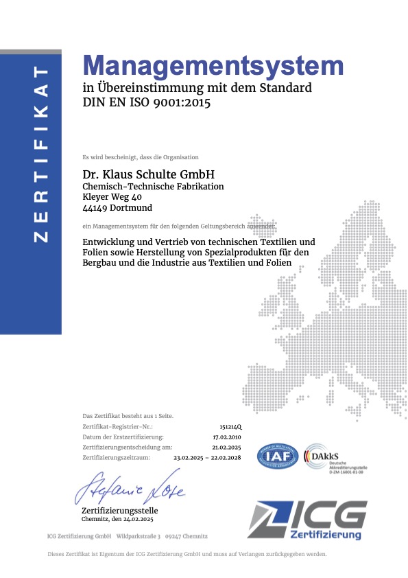 Zertifiziert nach DIN EN ISO 9001:2015, spezialisieren wir uns auf die Entwicklung und den Vertrieb technischer Textilien und Folien sowie die Herstellung von Spezialprodukten für den Berg- und Tiefbau.